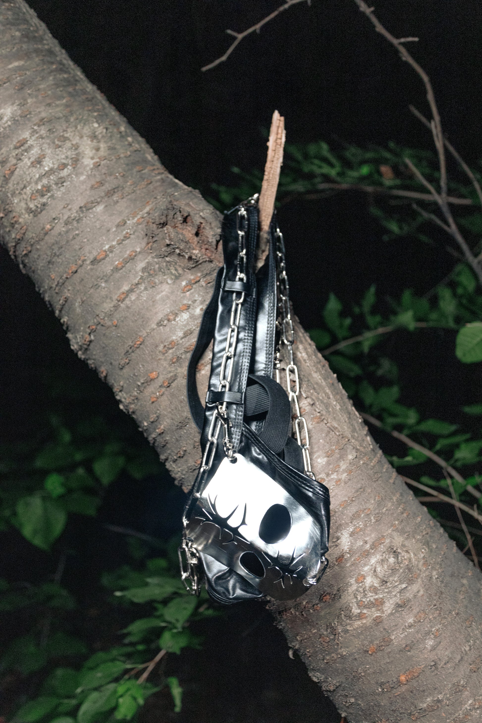 This is the jock that gets you flagged at airport security and thoroughly searched at your destination. Stretch lycra vinyl with a laser-cut mask logo positioned right where mouths tend to go, held together by polished nickel hardware and steel chain that clinks when you move. The construction holds up whether you're wearing it under jeans to the Eagle or getting pressed against the bathroom stall wall. Each has straps that adjust for thick thighs and chains that detach when you need to be discreet.